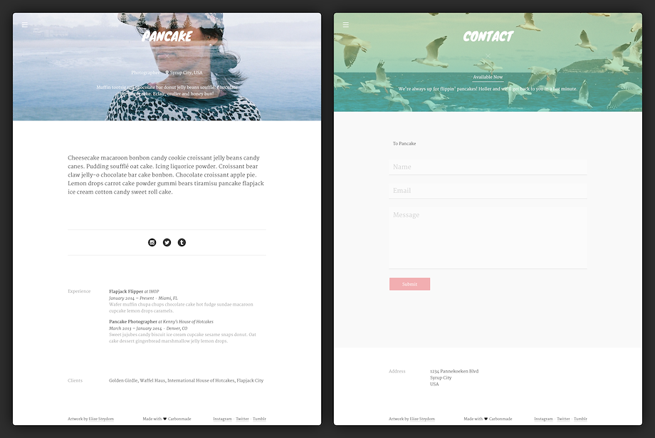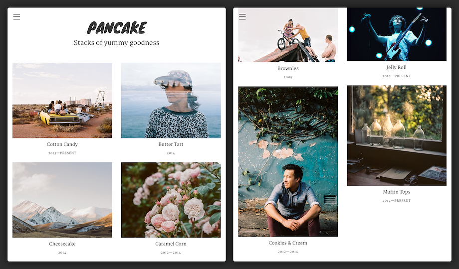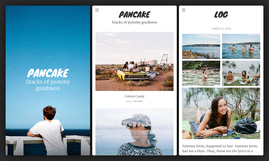 With its ginormous cover page and full-screen header images, Pancake is the perfect delivery system for photo essays, narrative projects and ridiculously good-lookin' pieces of work! It's fully responsive and scales beautifully from your phone to your desktop screen.