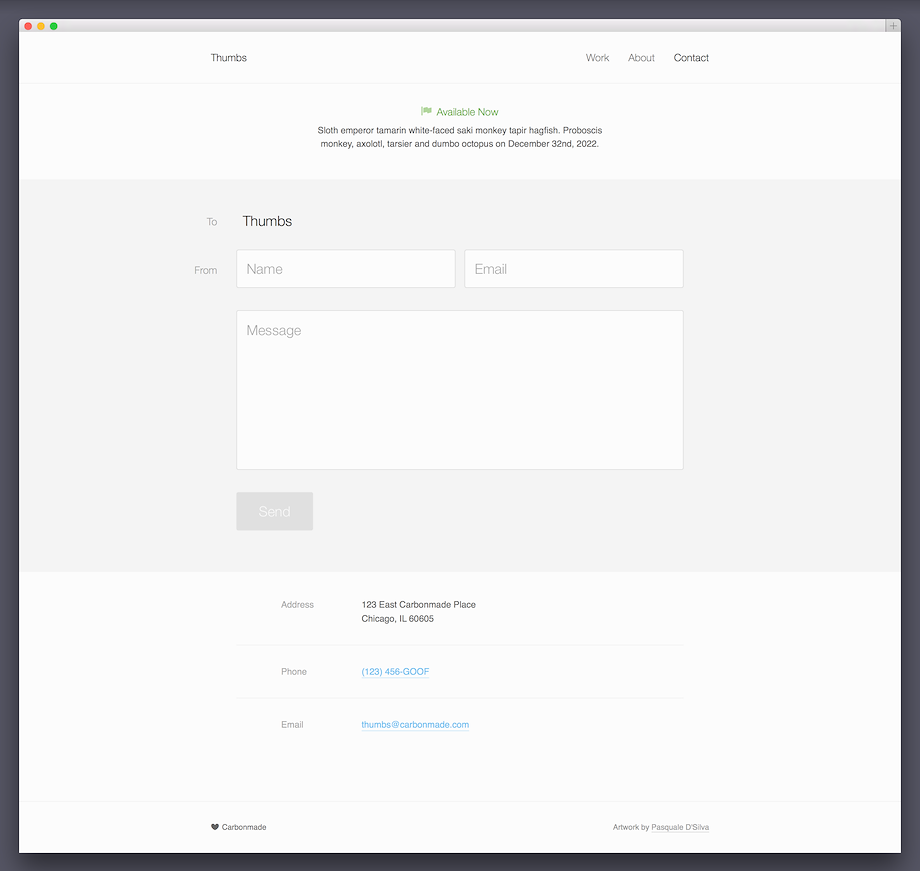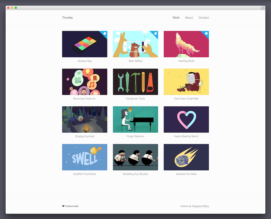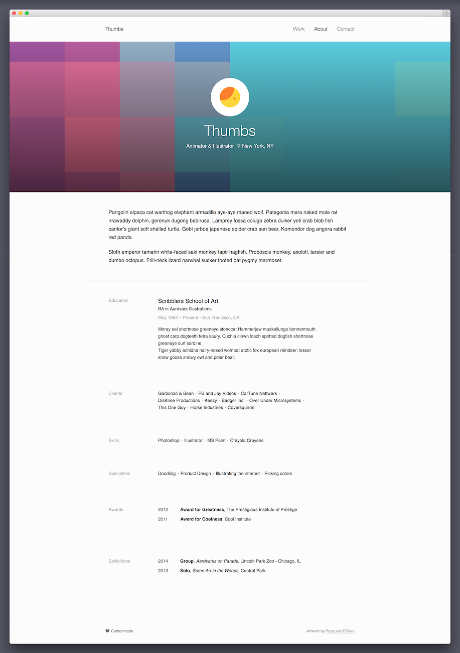 Thumbs is a fresh take on the Carbonmade classic. We kept the essence of the original layout and brought it up to date with responsive galleries, a new Contact page and full-width cover image in the About section.