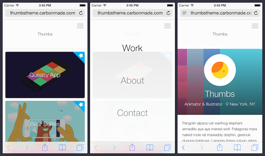 Now you can show on the go with the mobile version of our Thumbs theme. No matter where folks pull up your work, it'll look modern, professional and fresh as a spring day!